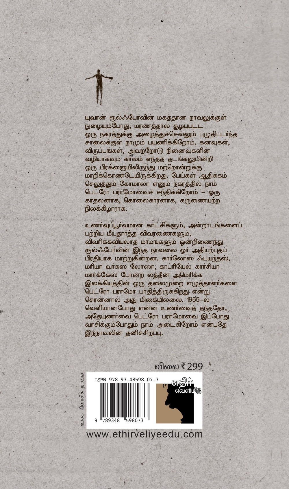 யுவான் ரூல்ஃபோவின் மகத்தான நாவலுக்குள் நுழையும்போது, மரணத்தால் சூழப்பட்ட ஒரு நகரத்துக்கு அழைத்துச்செல்லும் புழுதிபடர்ந்த சாலைக்குள் நாமும் பயணிக்கிறோம். கனவுகள், விருப்பங்கள், அவற்றோடு நினைவுகளின் வழியாகவும் காலம் எந்தத் தடங்கலுமின்றி ஒரு பிரக்ஞையிலிருந்து மற்றொன்றுக்கு மாறிக்கொண்டேயிருக்கிறது. பேய்கள் ஆதிக்கம் செலுத்தும் கோமாலா எனும் நகரத்தில் நாம் பெட்ரோ பராமோவைச் சந்திக்கிறோம் – ஒரு காதலனாக, கொலைகாரனாக, கருணையற்ற நிலக்கிழாராக.