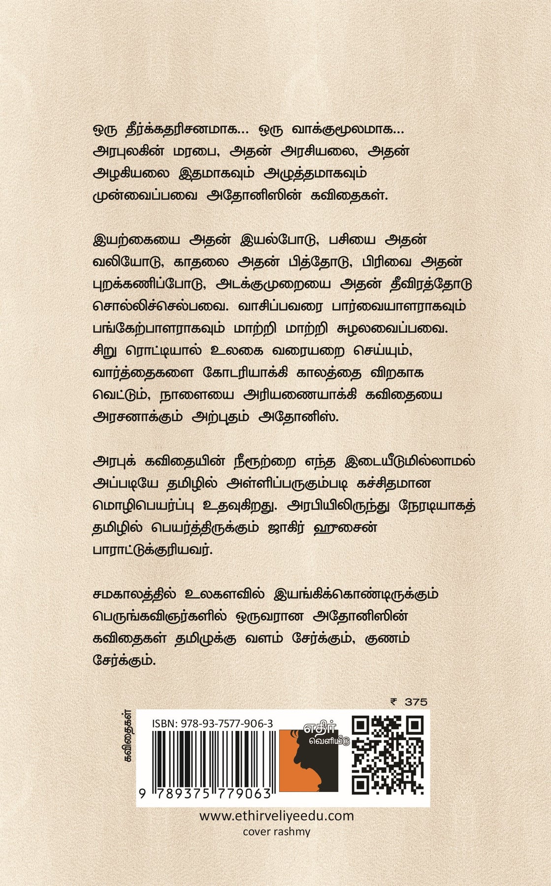 சமகாலத்தில் உலகளவில் இயங்கிக்கொண்டிருக்கும் பெருங்கவிஞர்களில் ஒருவரான அதோனிஸின் கவிதைகள் தமிழுக்கு வளம் சேர்க்கும், குணம் சேர்க்கும்.