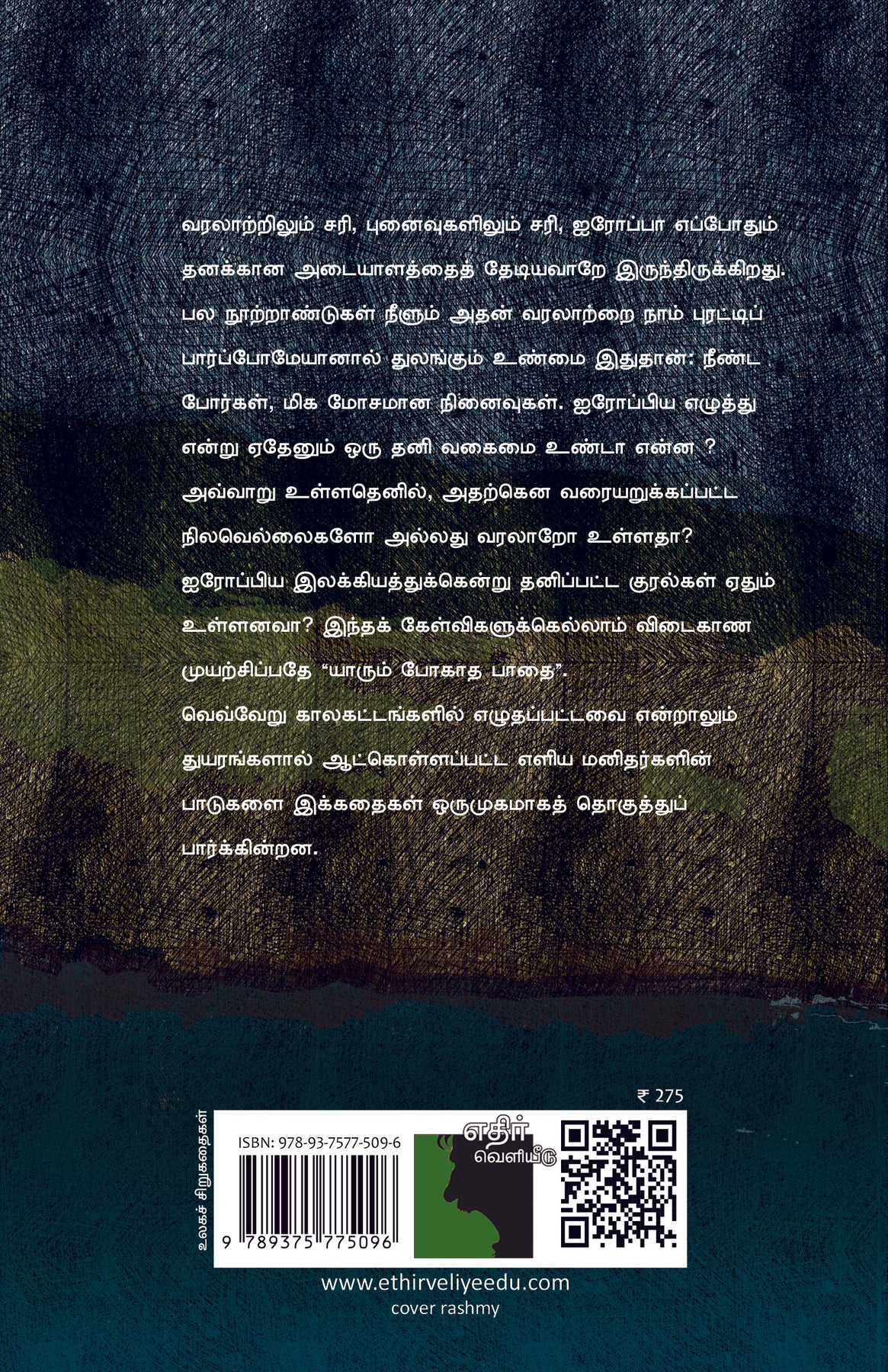 வரலாற்றிலும் சரி, புனைவுகளிலும் சரி, ஐரோப்பா எப்போதும் தனக்கான அடையாளத்தைத் தேடியவாறே இருந்திருக்கிறது. பல நூற்றாண்டுகள் நீளும் அதன் வரலாற்றை நாம் புரட்டிப் பார்ப்போமேயானால் துலங்கும் உண்மை இதுதான்: நீண்ட போர்கள், மிக மோசமான நினைவுகள். ஐரோப்பிய எழுத்து என்று ஏதேனும் ஒரு தனி வகைமை உண்டா என்ன? அவ்வாறு உள்ளதெனில், அதற்கென வரையறுக்கப்பட்ட நிலவெல்லைகளோ அல்லது வரலாறோ உள்ளதா? ஐரோப்பிய இலக்கியத்துக்கென்று தனிப்பட்ட குரல்கள் ஏதும் உள்ளனவா? இந்தக் கேள்விகளுக்கெல்லாம் விடைகாண முயற்சிப்பதே ”யாரும் போகாத பாதை”. வெவ்வேறு காலகட்டங்களில் எழுதப்பட்டவை என்றானாலும் துயரங்களால் ஆட்கொள்ளப்பட்ட எளிய மனிதர்களின் பாடுகளை இக்கதைகள் ஒருமுகமாகத் தொகுத்துப் பார்க்கின்றன.