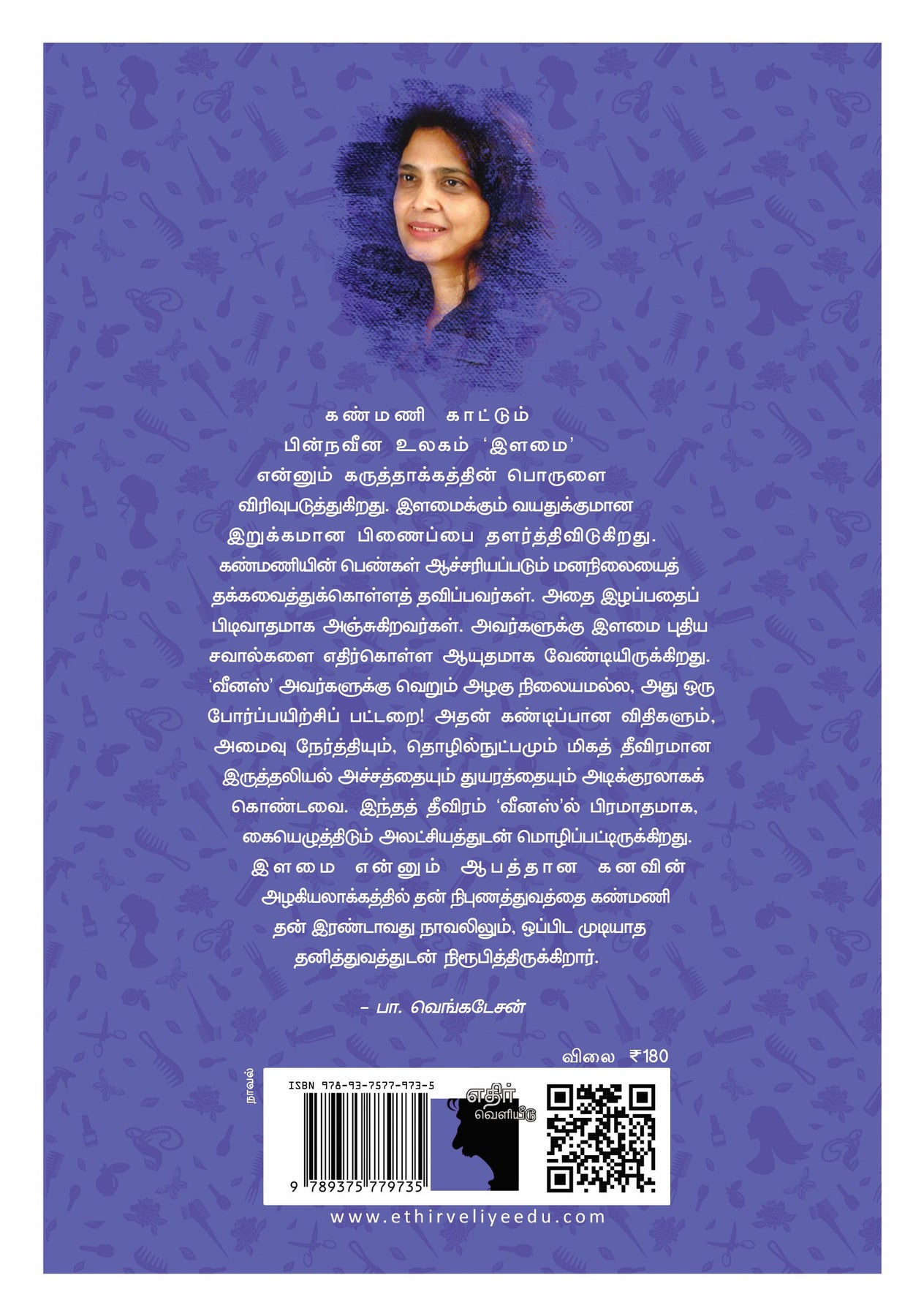 கண்மணி காட்டும் பின்நவீன உலகம் 'இளமை' என்னும் கருத்தாக்கத்தின் பொருளை விரிவுபடுத்துகிறது. இளமைக்கும் வயதுக்குமான இறுக்கமான பிணைப்பை தளர்த்திவிடுகிறது. கண்மணியின் பெண்கள் ஆச்சரியப்படும் மனநிலையைத் தக்கவைத்துக்கொள்ளத் தவிப்பவர்கள். அதை இழப்பதைப் பிடிவாதமாக அஞ்சுகிறவர்கள். அவர்களுக்கு இளமை புதிய சவால்களை எதிர்கொள்ள ஆயுதமாக வேண்டியிருக்கிறது. 'வீனஸ்' அவர்களுக்கு வெறும் அழகு நிலையமல்ல, அது ஒரு போர்ப்பயிற்சிப் பட்டறை! அதன் கண்டிப்பான விதிகளும், அமைவு நேர்த்தியும், தொழில்நுட்பமும் மிகத் தீவிரமான இருத்தலியல் அச்சத்தையும் துயரத்தையும் அடிக்குரலாகக் கொண்டவை. இந்தத் தீவிரம் 'வீனஸ்'ல் பிரமாதமாக, கையெழுத்திடும் அலட்சியத்துடன் மொழிப்பட்டிருக்கிறது. இளமை என்னும் ஆபத்தான கனவின் அழகியலாக்கத்தில் தன் நிபுணத்துவத்தை கண்மணி தன் இரண்டாவது நாவலிலும், ஒப்பிட முடியாத தனித்துவத்துடன் நிரூபித்திருக்கிறார்.