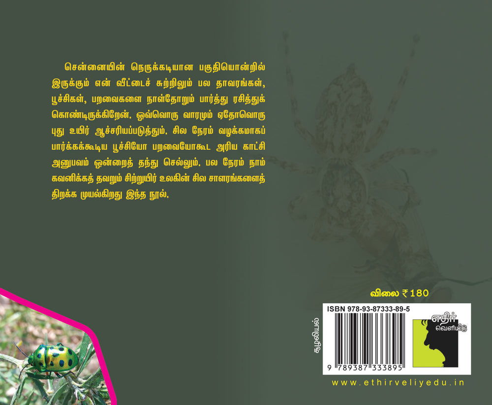 சென்னையின் நெருக்கடியான பகுதியொன்றில் இருக்கும் என் வீட்டைச் சுற்றிலும் பல தாவரங்கள், பூச்சிகள், பறவைகளை நாள்தோறும் பார்த்து ரசித்துக்கொண்டிருக்கிறேன். ஒவ்வொரு வாரமும் ஏதோவொரு புது உயிர் ஆச்சரியப்படுத்தும். சில நேரம் வழக்கமாகப் பார்க்கக்கூடிய பூச்சியோ பறவையோகூட அரிய காட்சி அனுபவம் ஒன்றைத் தந்து செல்லும். பல நேரம் நாம் கவனிக்கத் தவறும் சிறிய பூச்சிகளுடைய உலகின் சில சாளரங்களைத் திறக்க முயல்கிறது இந்த நூல்.