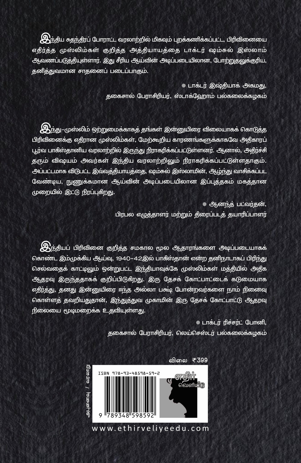 இந்திய சுதந்திரப் போராட்ட வரலாற்றில் மிகவும் புறக்கணிக்கப்பட்ட, பிரிவினையை எதிர்த்த முஸ்லிம்கள் குறித்த அத்தியாயத்தை டாக்டர் ஷம்சுல் இஸ்லாம் ஆவணப்படுத்தியுள்ளார். இது சீரிய ஆய்வின் அடிப்படையிலான, போற்றுதலுக்குரிய, தனித்துவமான சாதனைப் படைப்பாகும்.