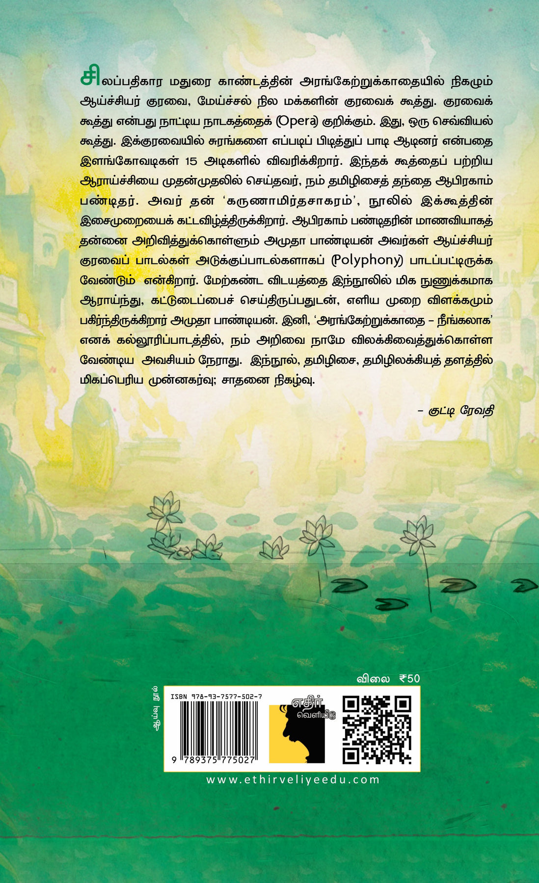 சிலப்பதிகார மதுரை காண்டத்தின் அரங்கேற்றுக்காதையில் நிகழும் ஆய்ச்சியர் குரவை, மேய்ச்சல் நில மக்களின் குரவைக் கூத்து. குரவைக்கூத்து என்பது நாட்டிய நாடகத்தைக் (Opera) குறிக்கும். இது, ஒரு செவ்வியல் கூத்து. இக்குரவையில் சுரங்களை எப்படிப் பிடித்துப் பாடி ஆடினர் என்பதை இளங்கோவடிகள் 15 அடிகளில் விவரிக்கிறார். இந்தக் கூத்தைப் பற்றிய ஆராய்ச்சியை முதன்முதலில் செய்தவர், நம் தமிழிசைத் தந்தை ஆபிரகாம் பண்டிதர். அவர் தன் ‘கருணாமிர்தசாகரம்’, நூலில் இக்கூத்தின் இசைமுறையைக் கட்டவிழ்த்திருக்கிறார். ஆபிரகாம் பண்டிதரின் மாணவியாகத் தன்னை அறிவித்துக்கொள்ளும் அமுதா பாண்டியன் அவர்கள் ஆய்ச்சியர் குரவை பாடல்கள் அடுக்குப்பாடல்களாகப் (Polyphony) பாடப்பட்டிருக்கவேண்டும் என்கிறார். மேற்கண்ட விடயத்தை இந்நூலில் மிக நுணுக்கமாக ஆராய்ந்து, கட்டுடைப்பைச் செய்திருப்பதுடன், எளிய முறை விளக்கமும் பகிர்ந்திருக்கிறார் அமுதா பாண்டியன். இனி, ‘அரங்கேற்றுக்காதை - நீங்கலாக’ எனக்கல்லூரிப்பாடத்தில், நம் அறிவை நாமே விலக்கிவைத்துக்கொள்ள வேண்டிய அவசியம் நேராது. இந்நூல், தமிழிசை, தமிழிலக்கியத் தளத்தில் மிகப்பெரிய முன்னகர்வு; சாதனை நிகழ்வு.