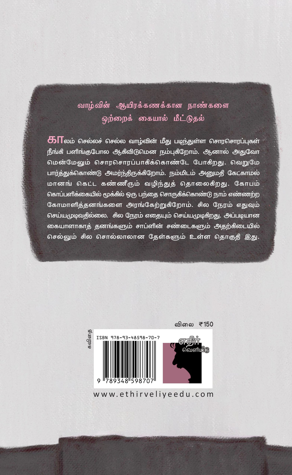 காலம் செல்லச் செல்ல வாழ்வின் மீது படிந்துள்ள சொரசொரப்புகள் நீங்கி பளிங்குபோல ஆகிவிடுமென நம்புகிறோம். ஆனால் அதுவோ மென்மேலும் சொரசொரப்பாகிக்கொண்டே போகிறது. வெறுமே பார்த்துக்கொண்டு அமர்ந்திருக்கிறோம். நம்மிடம் அனுமதி கேட்காமல் மானங் கெட்ட கண்ணீரும் வழிந்துத் தொலைகிறது. கோபம் கொப்பளிக்கையில் மூக்கில் ஒரு பந்தை சொருகிக்கொண்டு நாம் எண்ணற்ற கோமாளித்தனங்களை அரங்கேற்றுகிறோம். சில நேரம் எதுவும் செய்யமுடிவதில்லை. சில நேரம் எதையும் செய்யமுடிகிறது. அப்படியான கையாளாகாத் தனங்களும் சாப்ளின் சண்டைகளும் அதற்கிடையில் செல்லும் சில சொல்லாலான தேள்களும் உள்ள தொகுதி இது.
