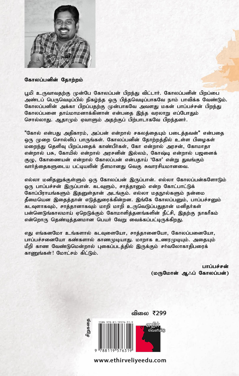 எல்லா மனிதனுக்குள்ளும் ஒரு கோலப்பன் இருப்பான். எல்லா கோலப்பன்களோடும் ஒரு பாப்பச்சன் இருப்பான். கடவுளும், சாத்தானும் என்ற கோட்பாட்டுக் கோப்பிராயங்களும் இதனுள்தான் அடங்கும். எல்லா மதநூல்களும் நன்மை தீமையென இதைத்தான் எடுத்துரைக்கின்றன. இங்கே கோலப்பனும், பாப்பச்சனும் கடவுளாகவும், சாத்தானாகவும் மாறி மாறி உருவெடுப்பதுதான் மனிதர்கள் பன்னெடுங்காலமாய் ஏறெடுக்கும் கோமாளித்தனங்களின் நீட்சி, இதற்கு நாகரீகம் என்றொரு தெண்டித்தனமான பெயர் வேறு வைக்கப்பட்டிருக்கிறது.
